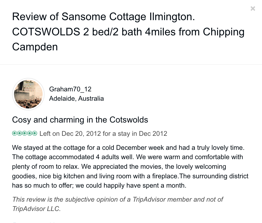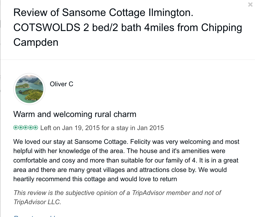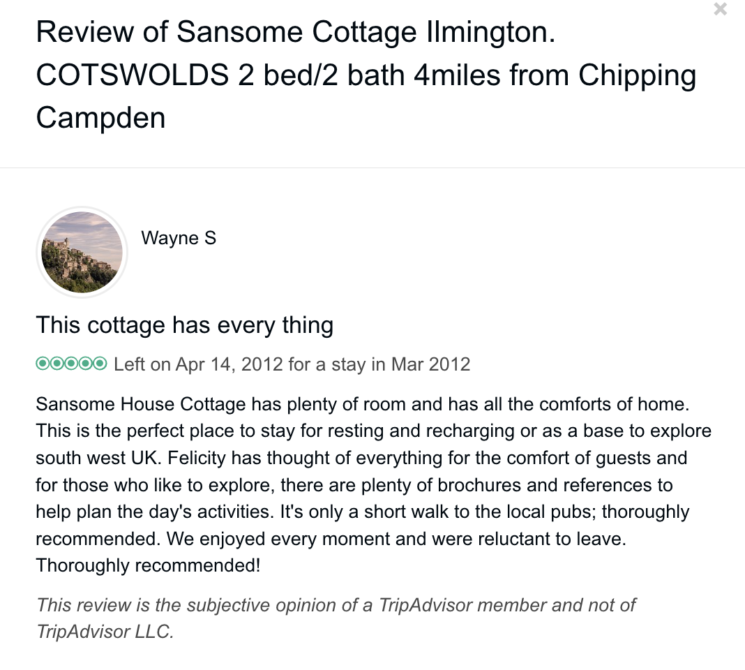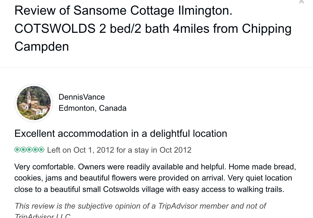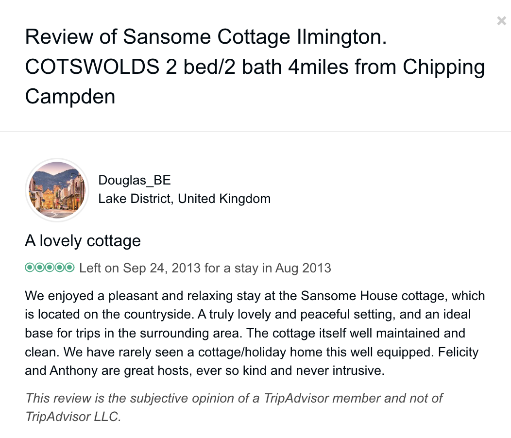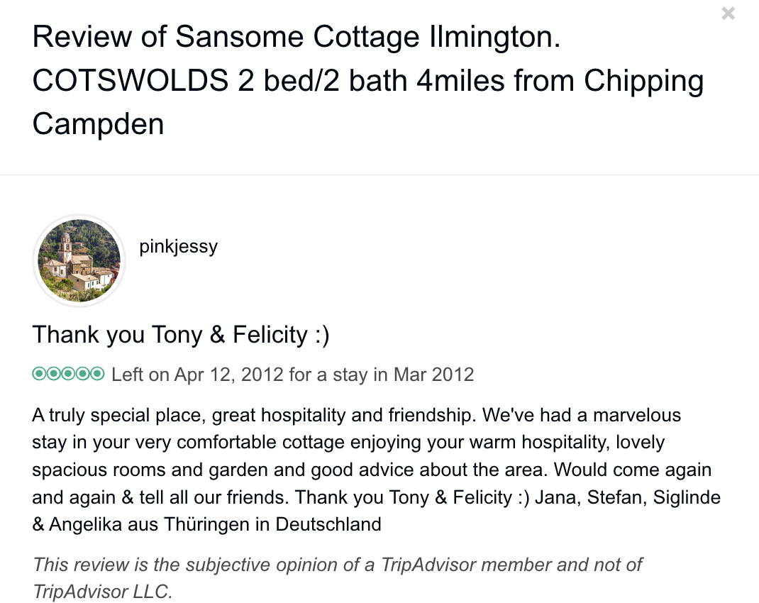 Trip Advisor closed the holiday let arm of their business at the end of October 2024 so you can no longer book through there - they direct you to VRBO. I have therefore screen shot my reviews from there which numbered 57, all five star. Except to be constantly updated and maintained the basic model of letting at the cottage has not changed since we started so I feel that even the old reviews still hold good.