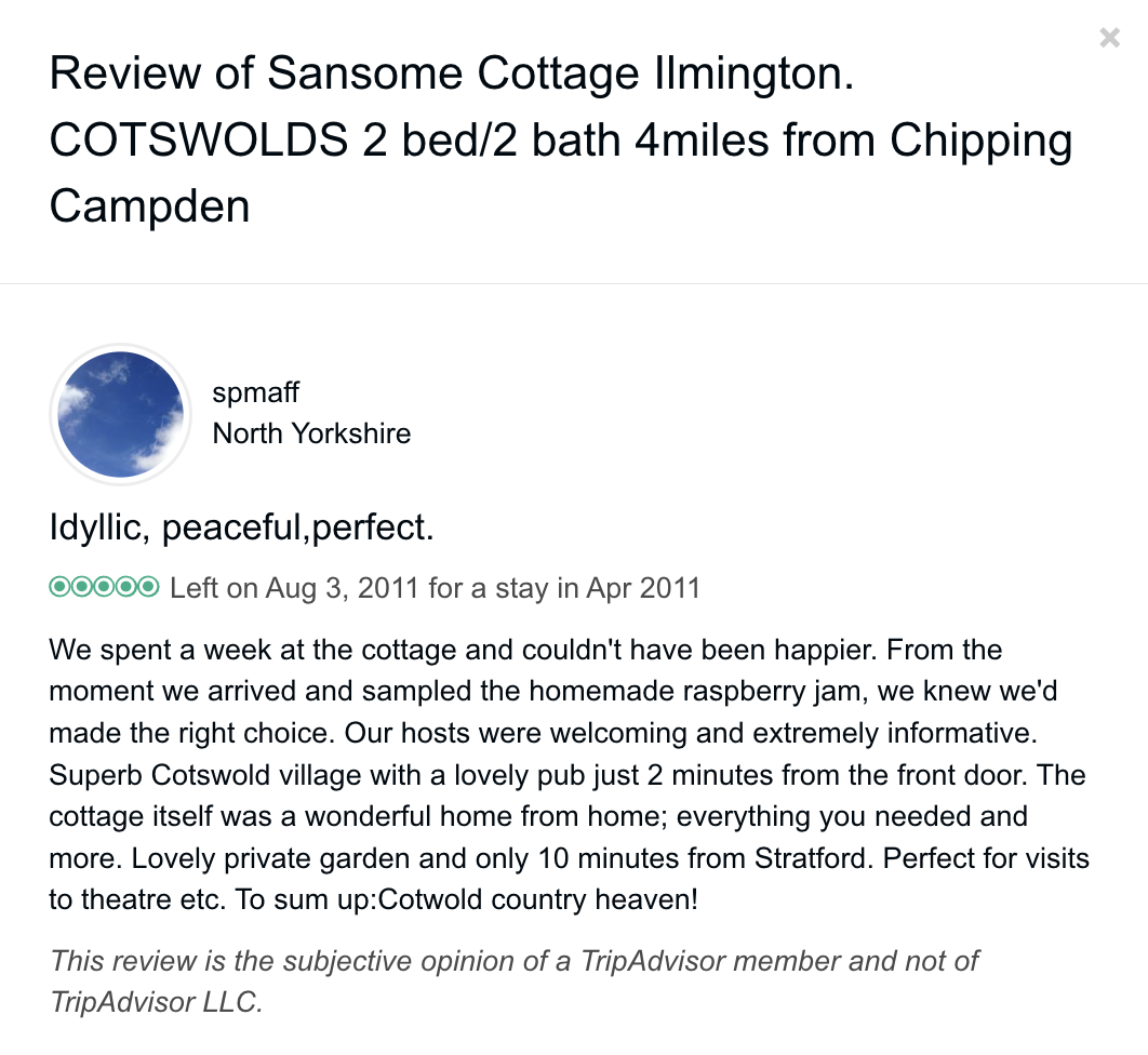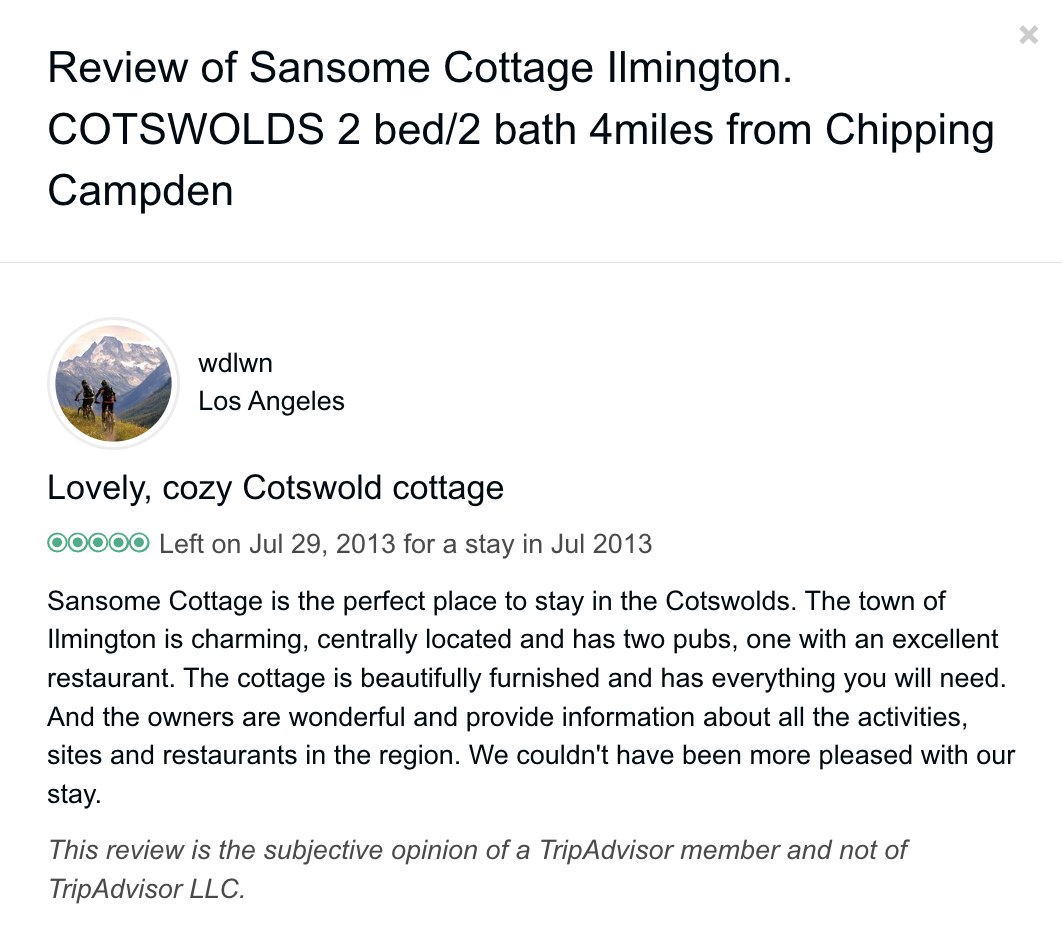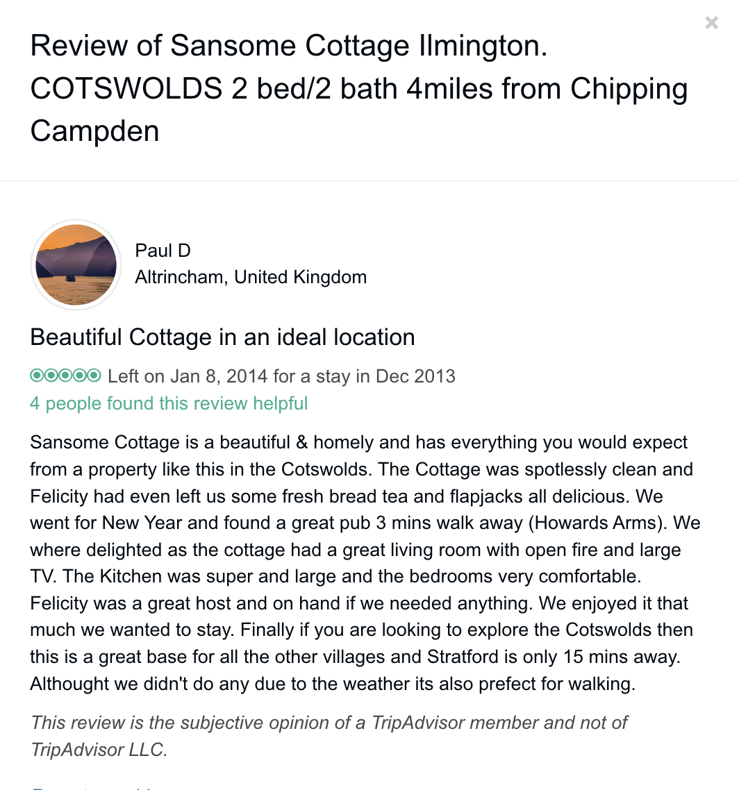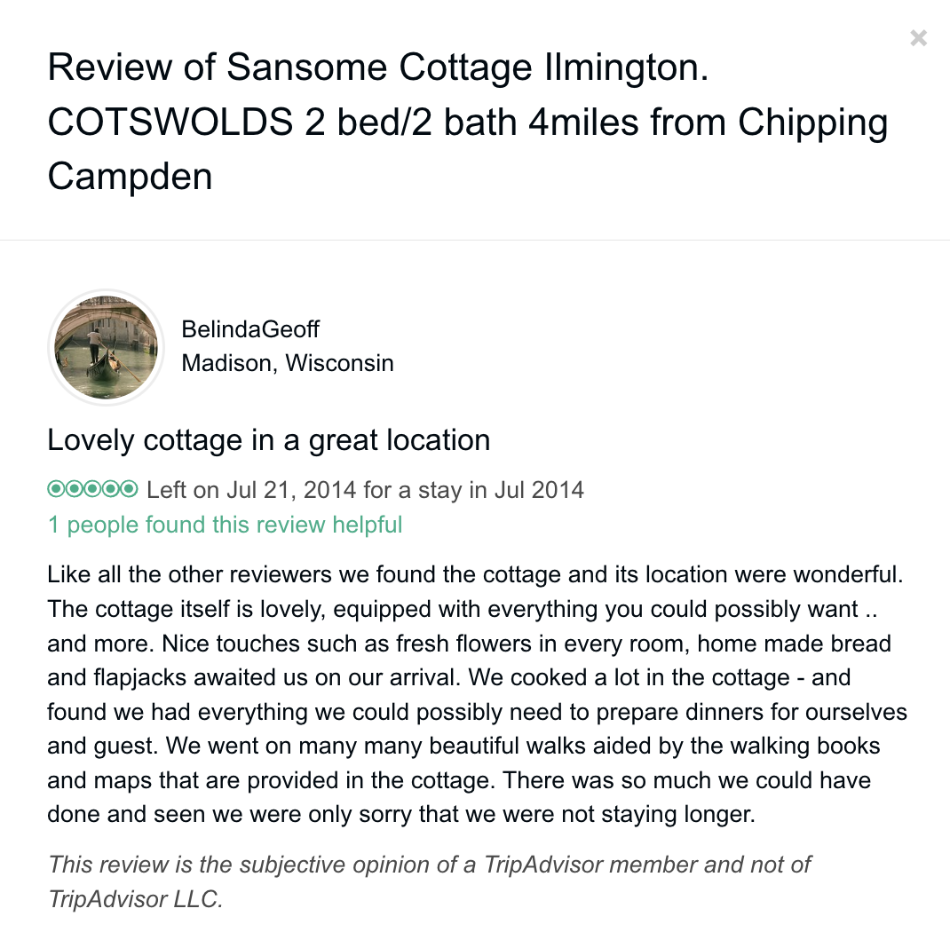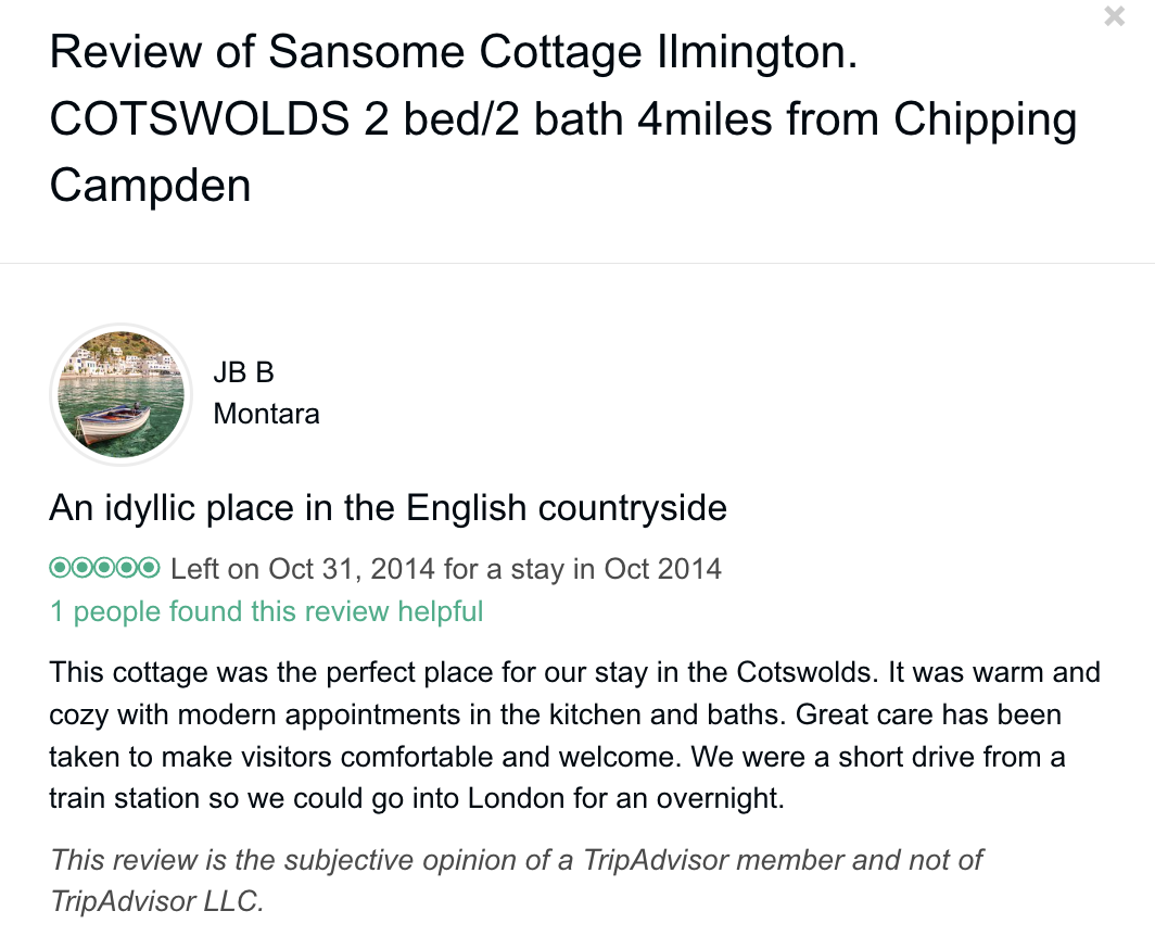 Trip Advisor closed the holiday let arm of their business at the end of October 2024 so you can no longer book through there - they direct you to VRBO. I have therefore screen shot my reviews from there which numbered 57, all five star. Except to be constantly updated and maintained the basic model of letting at the cottage has not changed since we started so I feel that even the old reviews still hold good.