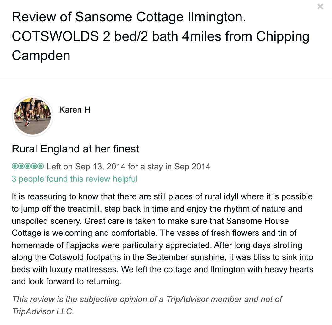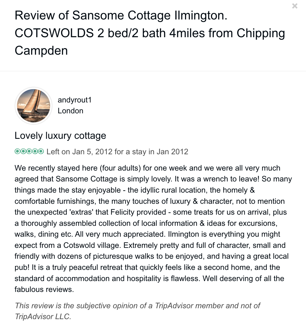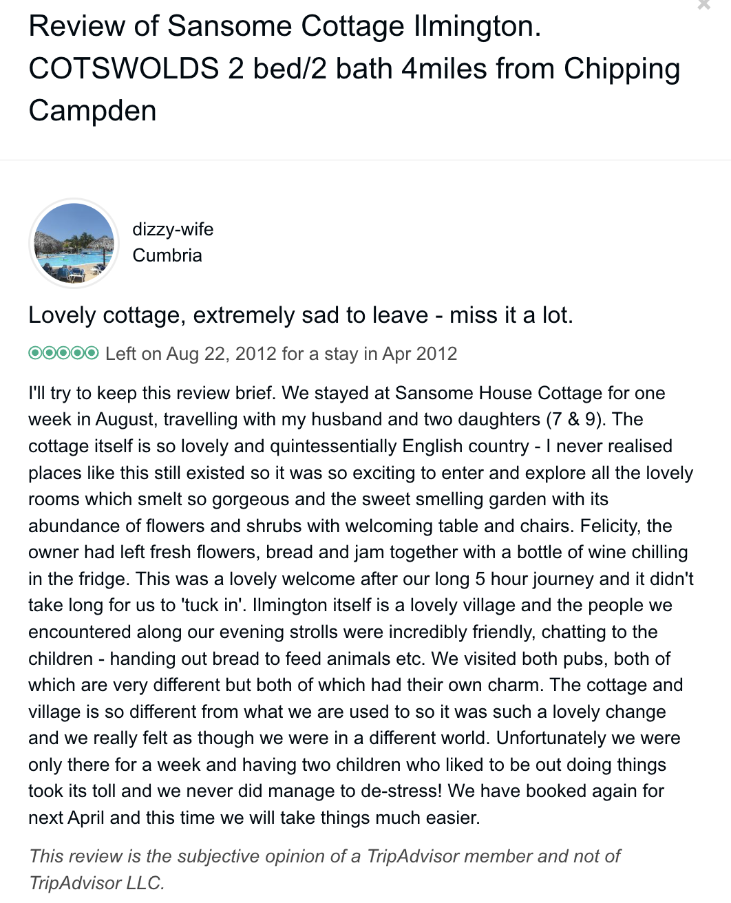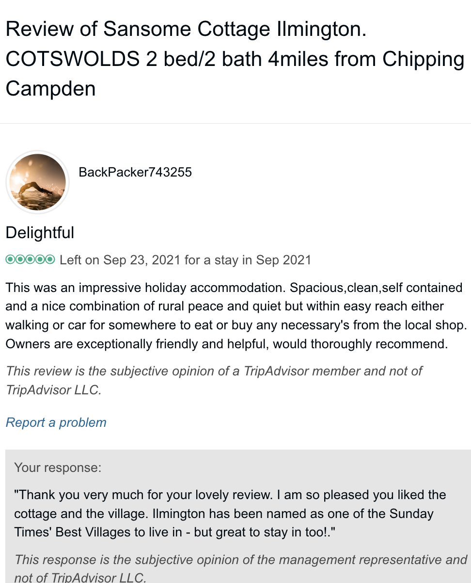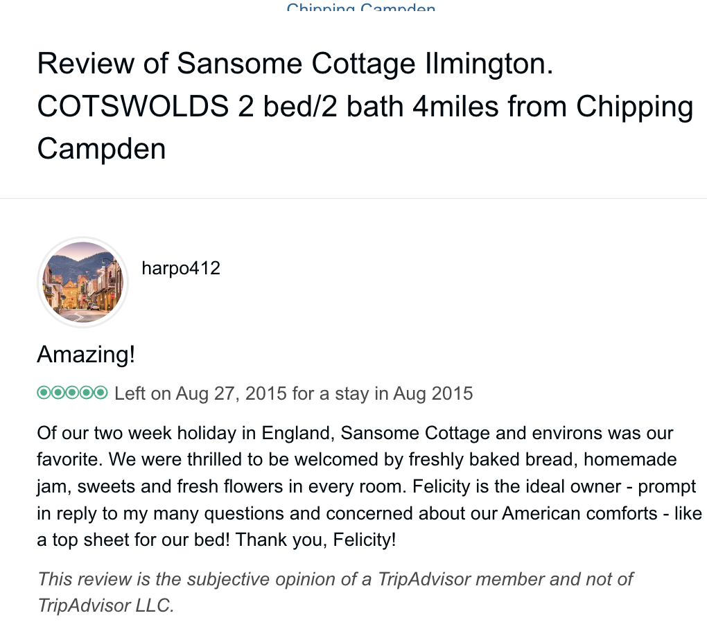 Trip Advisor closed the holiday let arm of their business at the end of October 2024 so you can no longer book through there - they direct you to VRBO. I have therefore screen shot my reviews from there which numbered 57, all five star. Except to be constantly updated and maintained the basic model of letting at the cottage has not changed since we started so I feel that even the old reviews still hold good.
