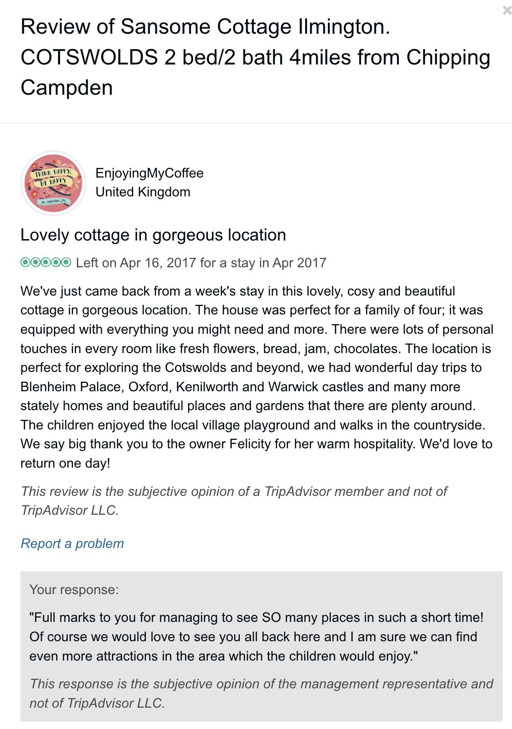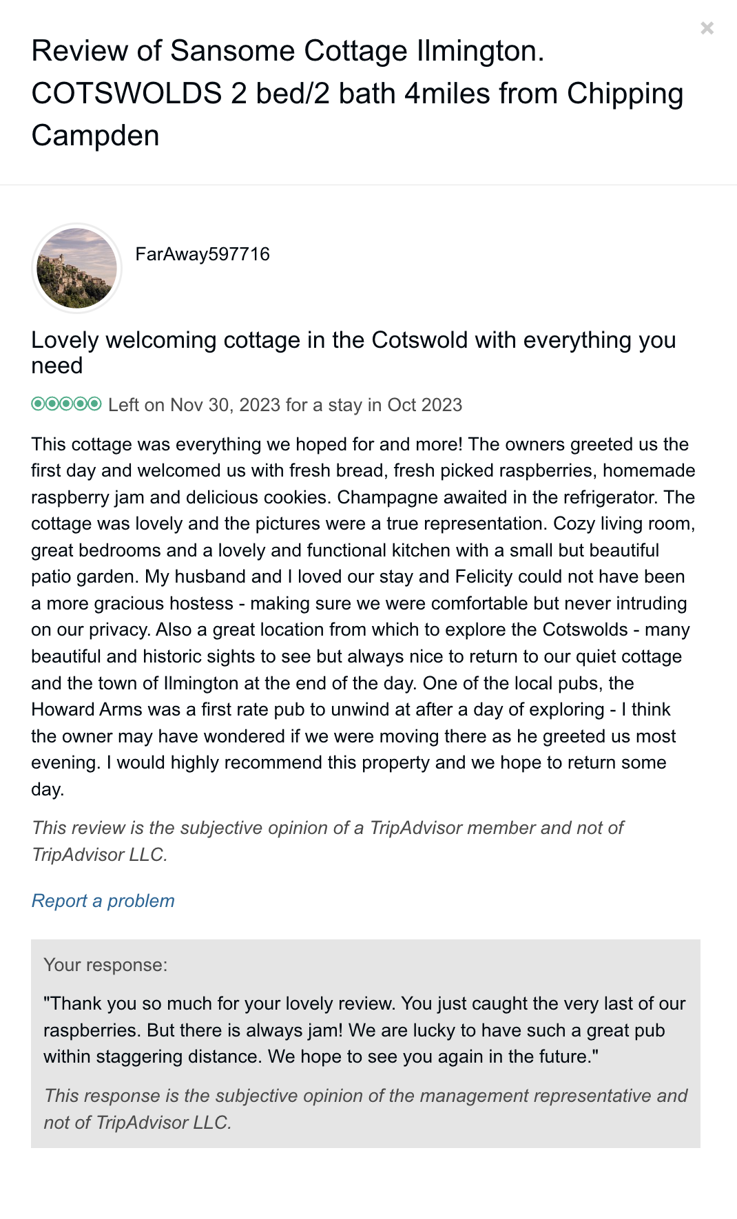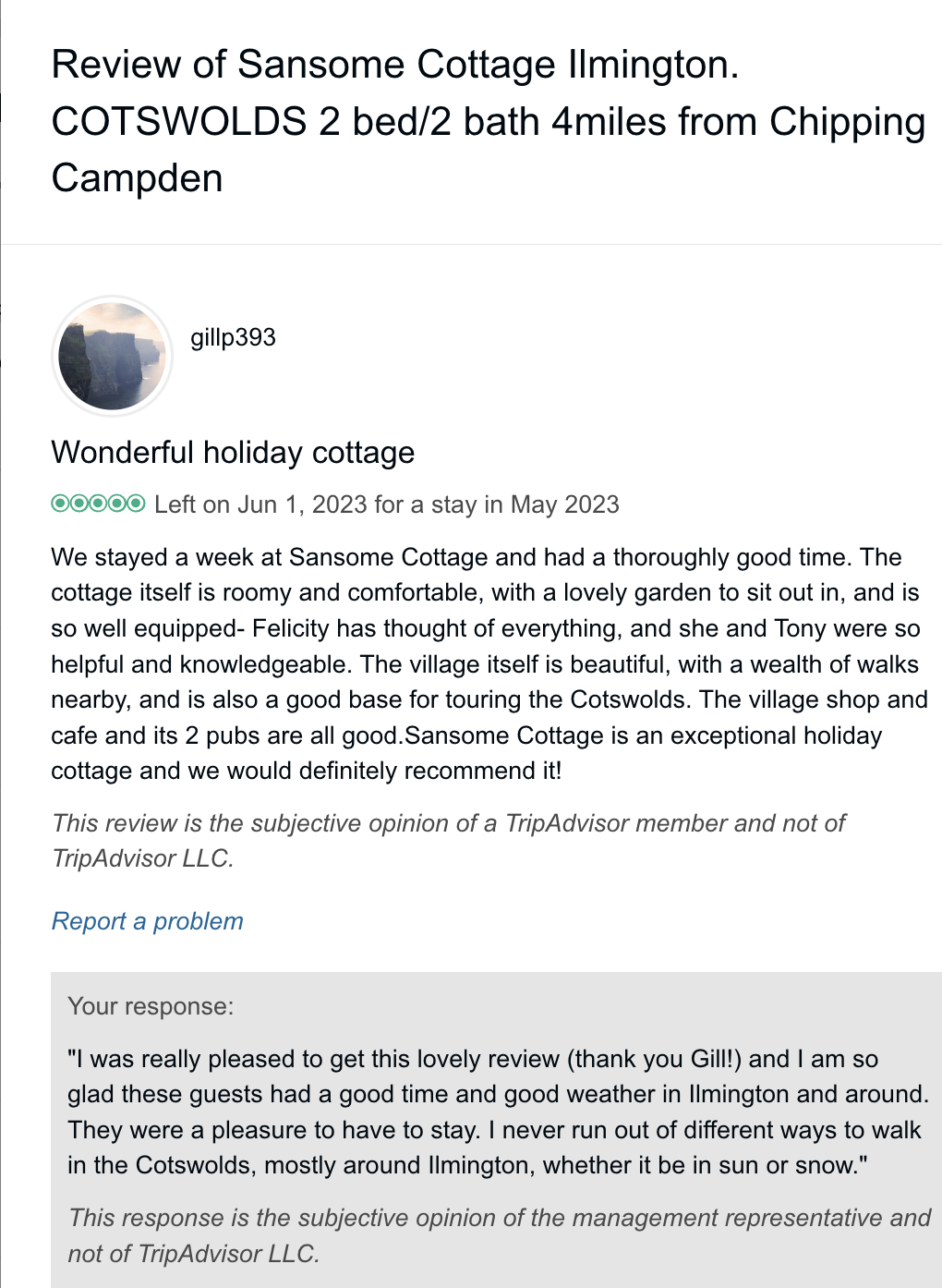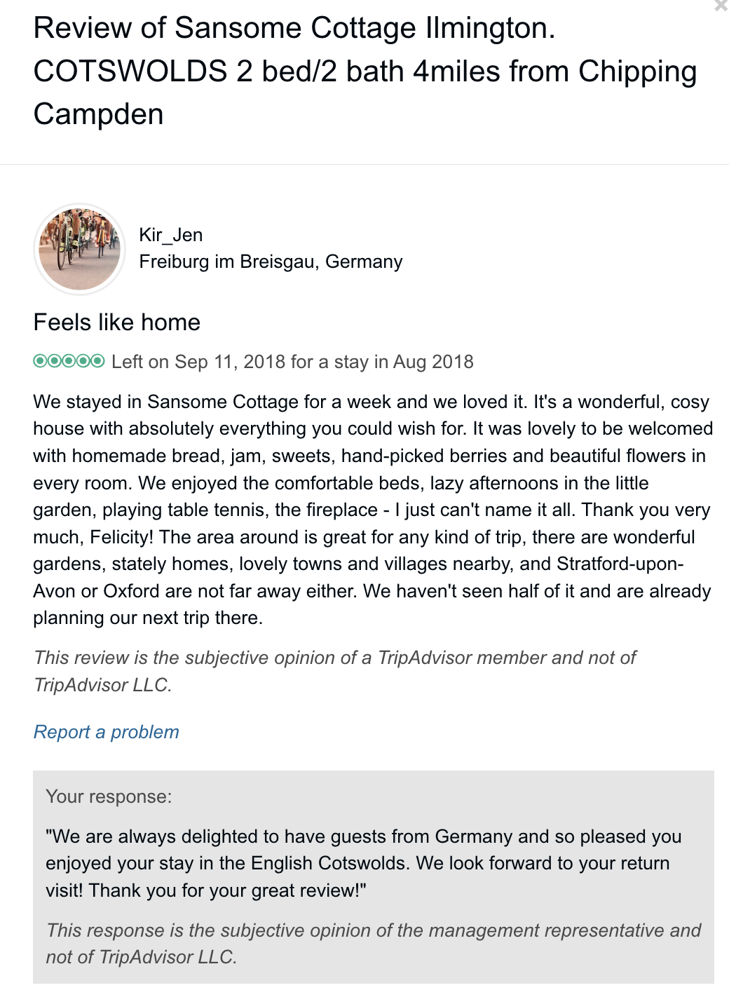 Trip Advisor closed the holiday let arm of their business at the end of October 2024 so you can no longer book through there - they direct you to VRBO. I have therefore screen shot my reviews from there which numbered 57, all five star. Except to be constantly updated and maintained the basic model of letting at the cottage has not changed since we started so I feel that even the old reviews still hold good.