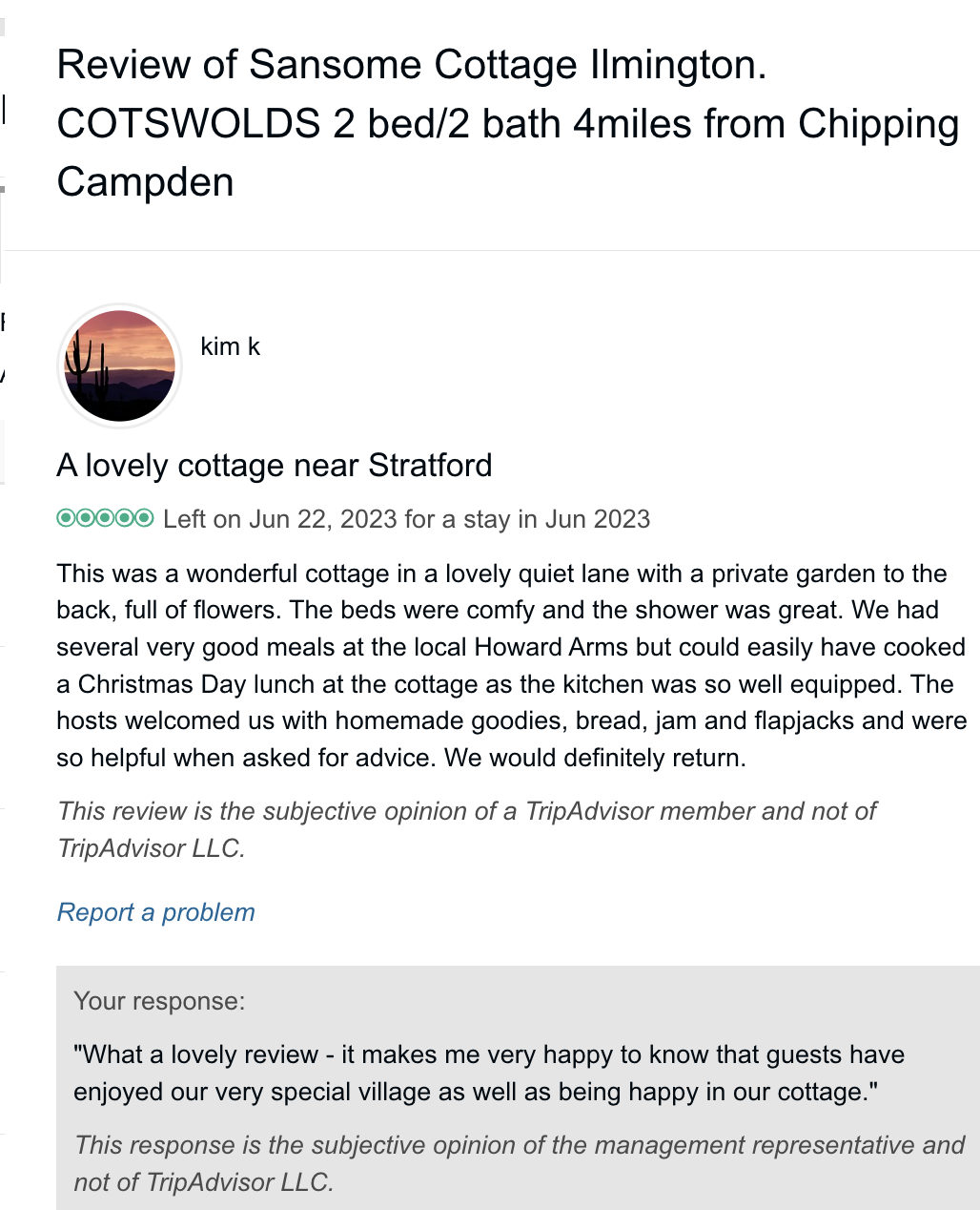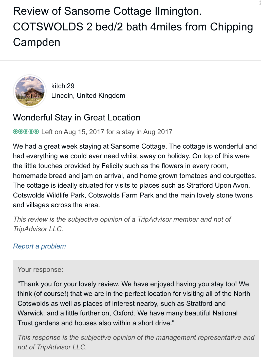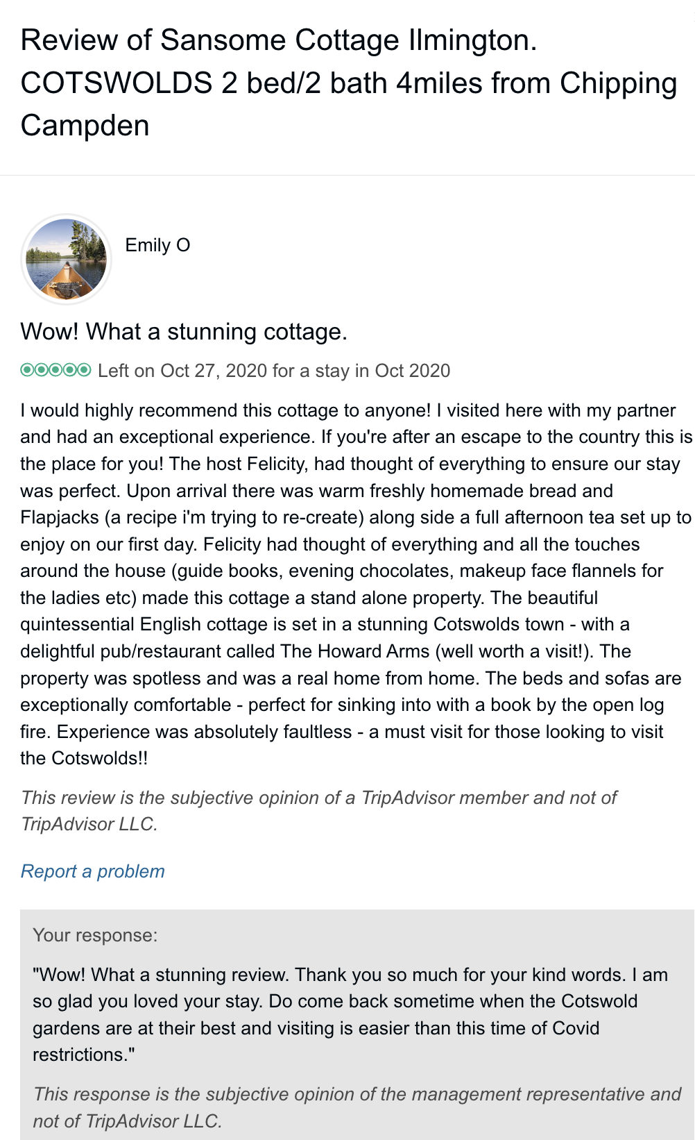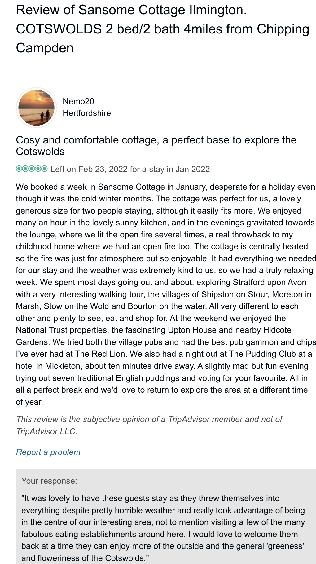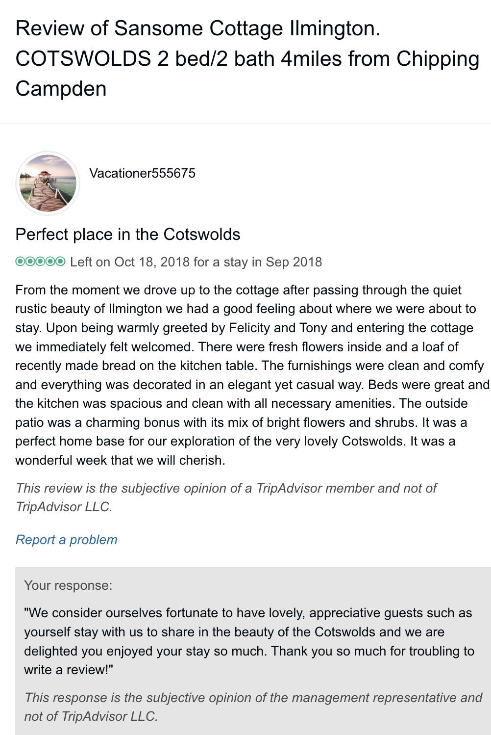 Trip Advisor closed the holiday let arm of their business at the end of October 2024 so you can no longer book through there - they direct you to VRBO. I have therefore screen shot my reviews from there which numbered 57, all five star. Except to be constantly updated and maintained the basic model of letting at the cottage has not changed since we started so I feel that even the old reviews still hold good.