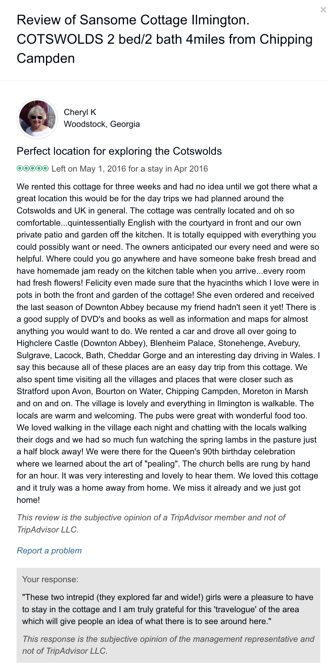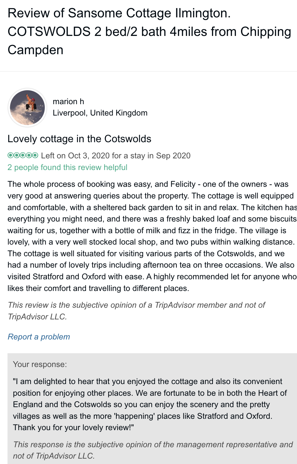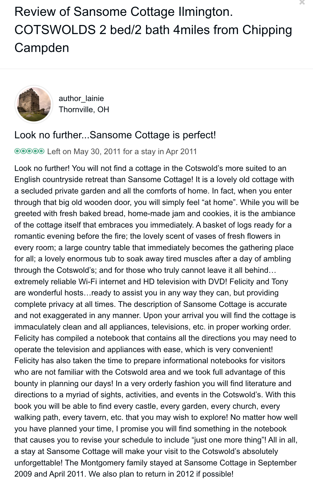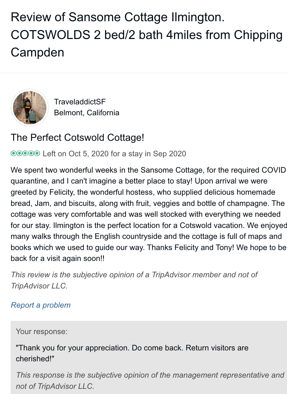 Trip Advisor closed the holiday let arm of their business at the end of October 2024 so you can no longer book through there - they direct you to VRBO. I have therefore screen shot my reviews from there which numbered 57, all five star. Except to be constantly updated and maintained the basic model of letting at the cottage has not changed since we started so I feel that even the old reviews still hold good.