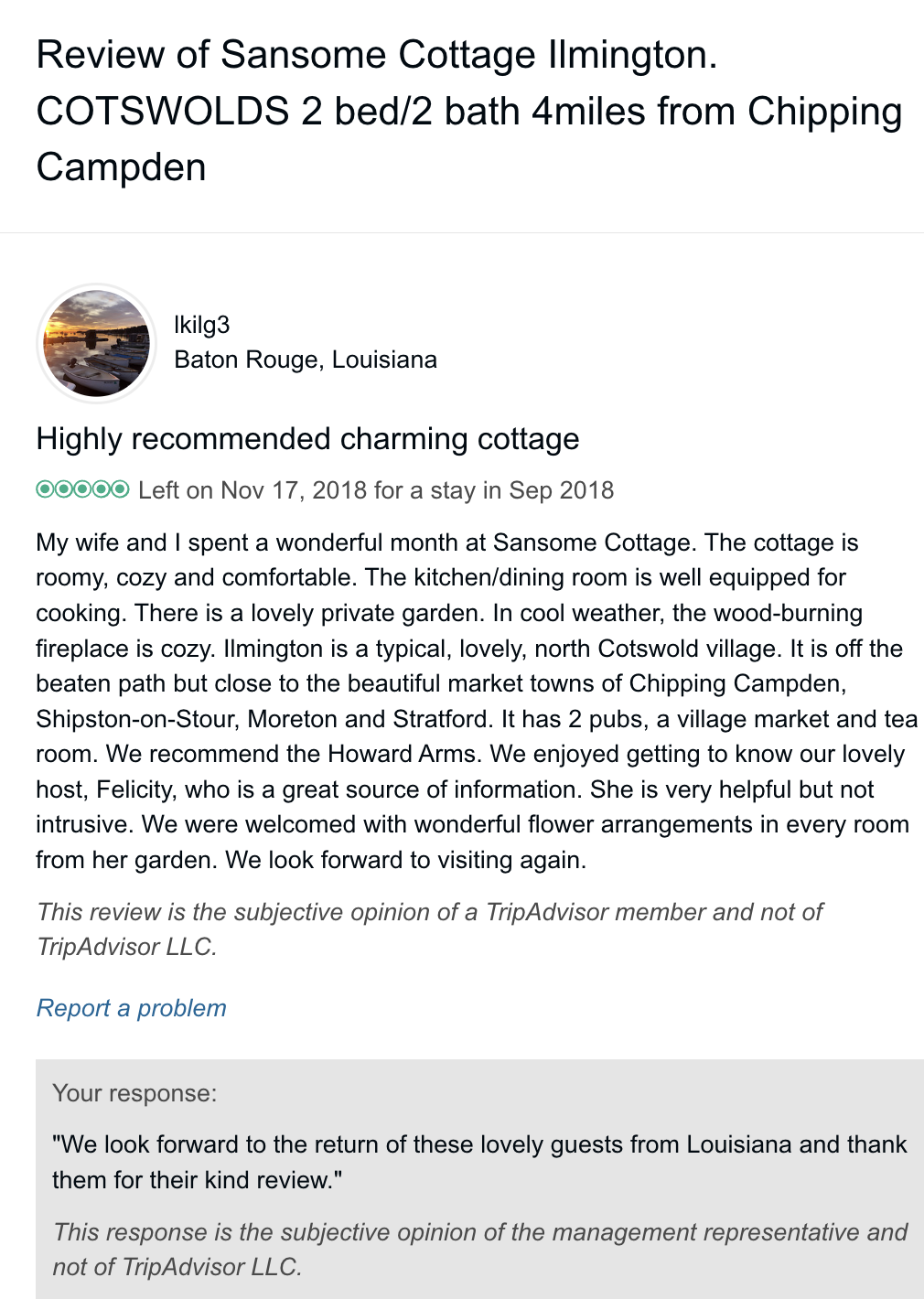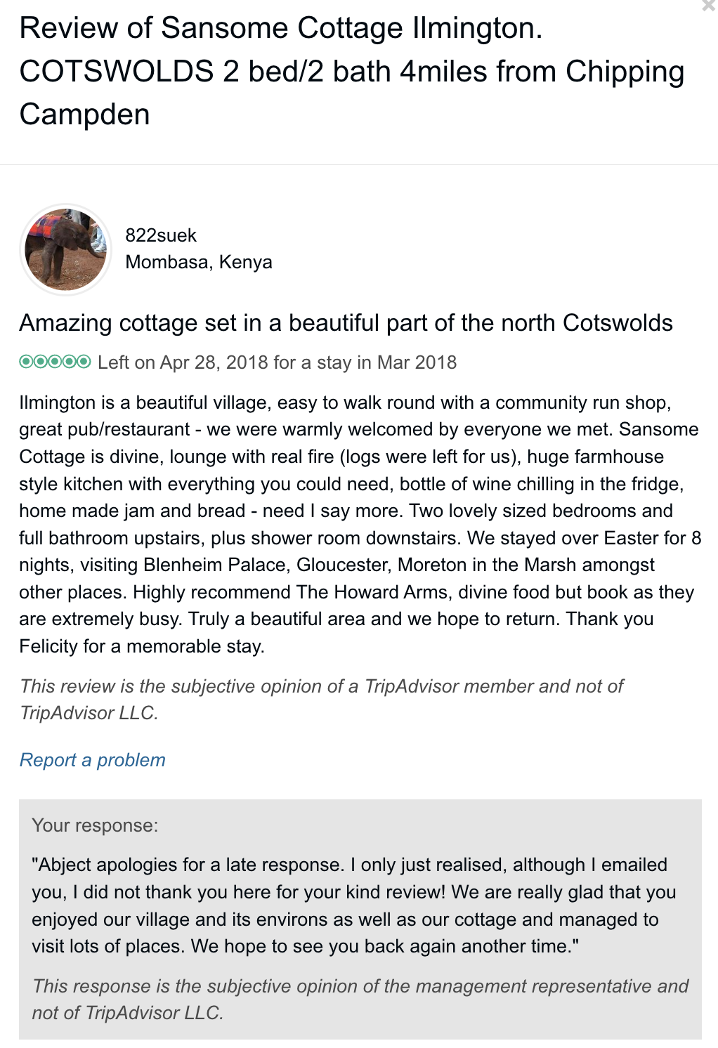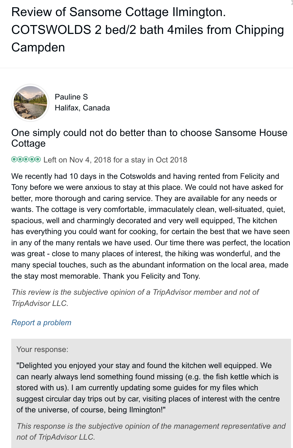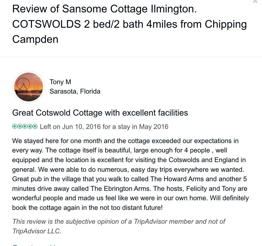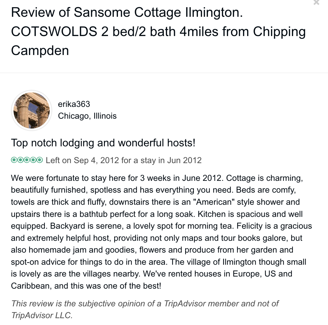 Reviews left on Trip Advisor (they no longer take bookings/accept reviews directly on their site)