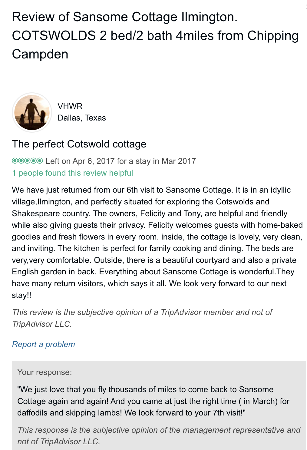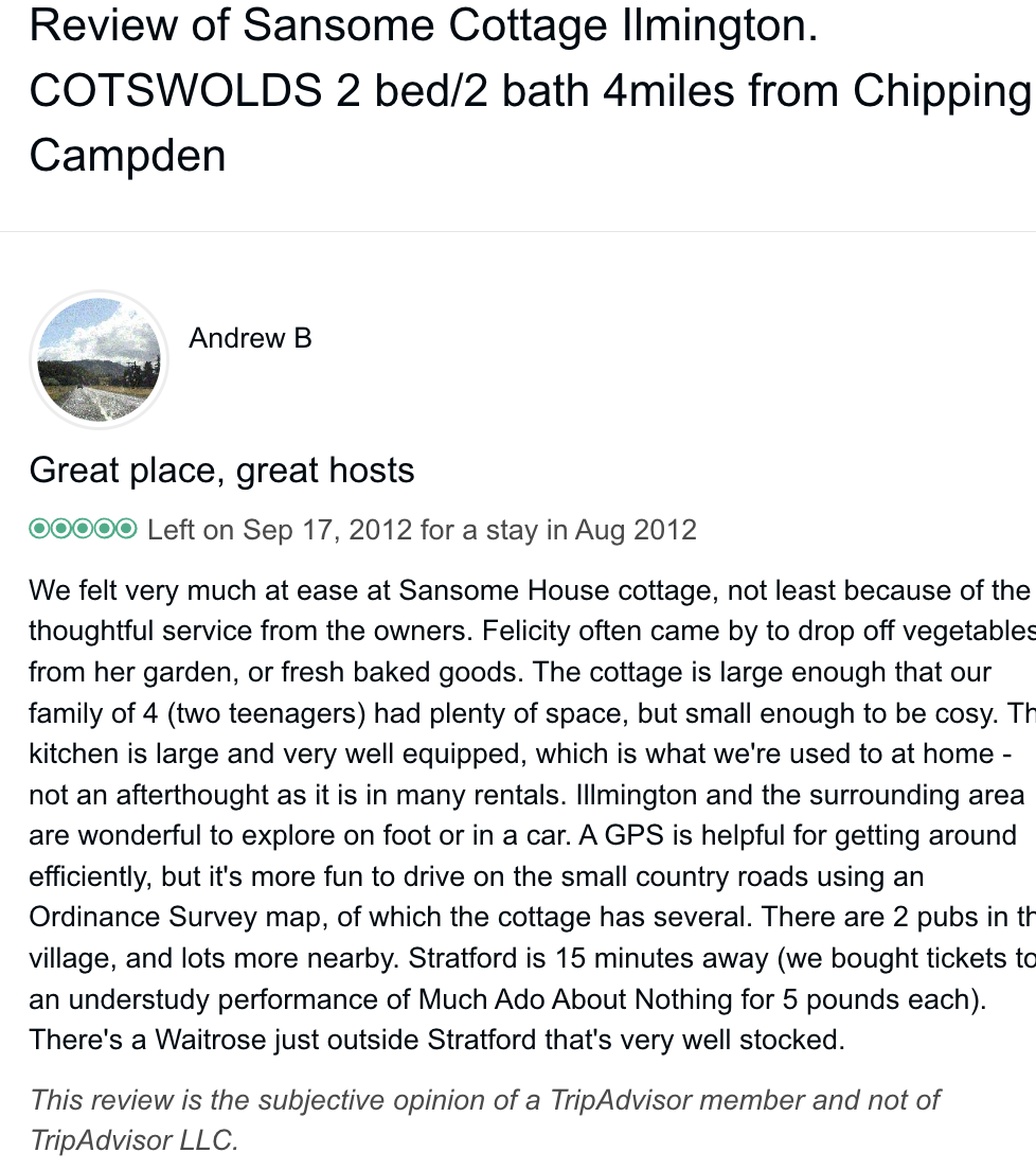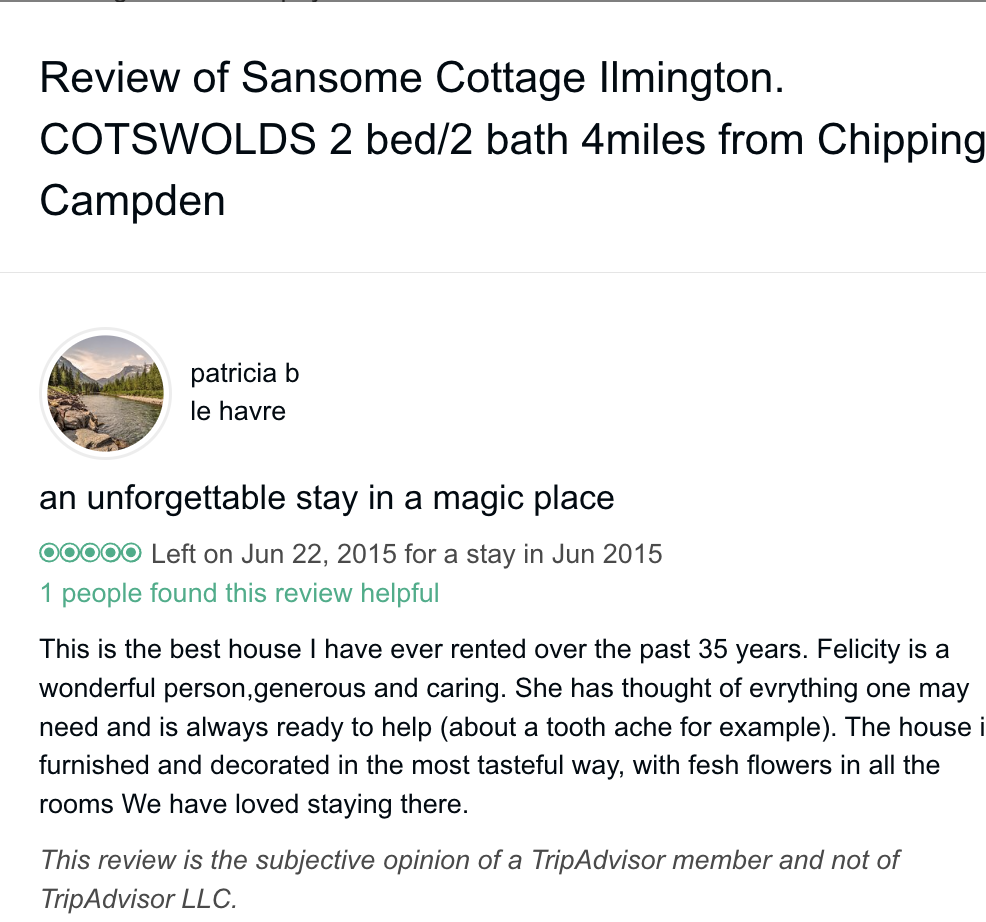These are some of the reviews that we received on Trip Advisor. Once they changed to a commission only model we got far fewer bookings as clever guests realised that it was much cheaper to book direct with me than through an online travel agent so I have had very few in recent years and most of these are several years old but the place is the same. Little has changed except for carpets, curtains, mattresses etc. The basic model and the welcome is the same. I would llke to take this opportunity to say that I have absolutely loved having everybody. whose reviews are here, to stay and thank them for the trouble taken writing a review on Trip Advisor. TA no longer do bookings for holiday rentals but click through to VRBO. I have put my reviews in photo form since I doubt mine will remain in cyberspace for much longer but the original listing, now ceased is here Trip Advisor Reviews